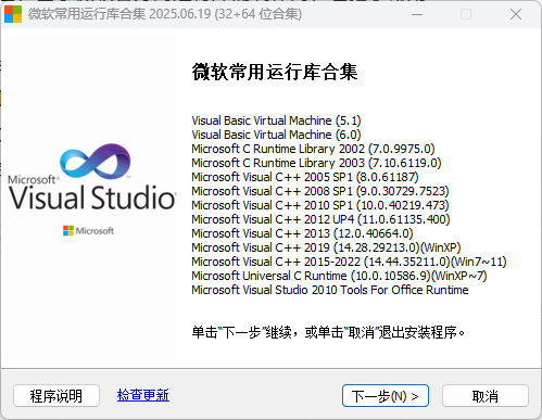 微软常用运行库合集适用于Windows系统的运行库合集包,基于微软官方的运行库而制作的,整合了所有版本Visual C ++,可自选更新VC++版本组件,支持win XP-11并自动识别系统环境。